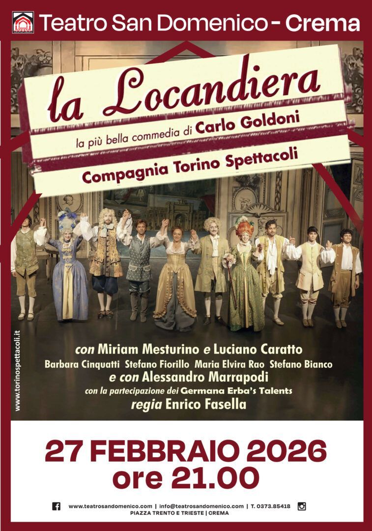 La “più bella commedia di Carlo Goldoni” vede protagonista Miriam Mesturino, accreditata interprete goldoniana, affiancata da Luciano Caratto, con Alessandro Marrapodi. Questo brillantissimo capolavoro goldoniano, andato in scena al Teatro Sant’Angelo di Venezia il 26 dicembre 1752, narra l’avventura di Mirandolina, serva e padrona al tempo stesso di una locanda fiorentina. Mirandolina è un’ottima locandiera; oggi la definiremmo una capace donna-manager. Intorno a lei personaggi spassosissimi: il Conte parvenu e spendaccione; il Marchese spocchioso visionario d’una antica ricchezza e d’una presente, inutile nobiltà; il Cavaliere misogino ma più di ogni altro ingenuo e Fabrizio, sinceramente innamorato.